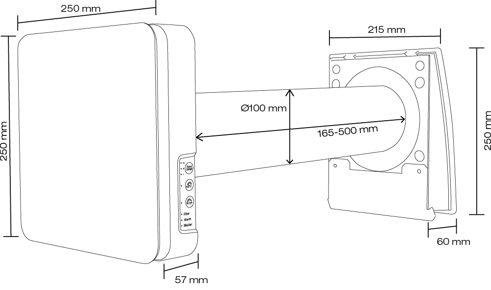 DUKA One Pro 25 B has a pipe diameter of 100 mm, making the unit ideal for bringing up a Ø105 mm or 150 x 150 mm fresh air valve for a heat recovery solution. The core of the DUKA One Pro 25 B is 165 mm, making this unit ideal for holiday homes where the walls are thinner
